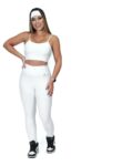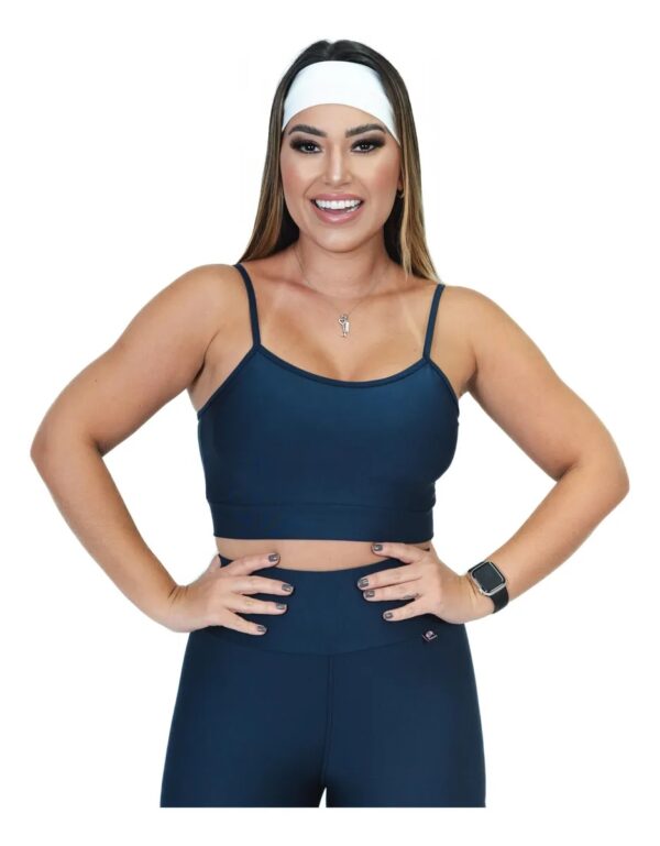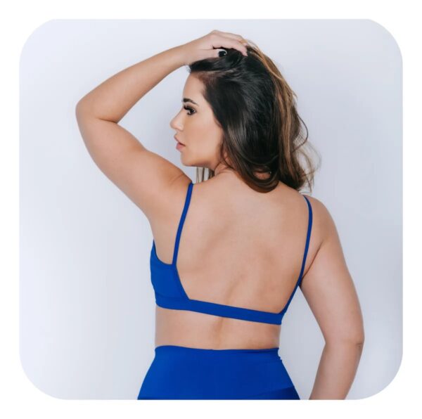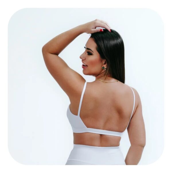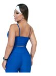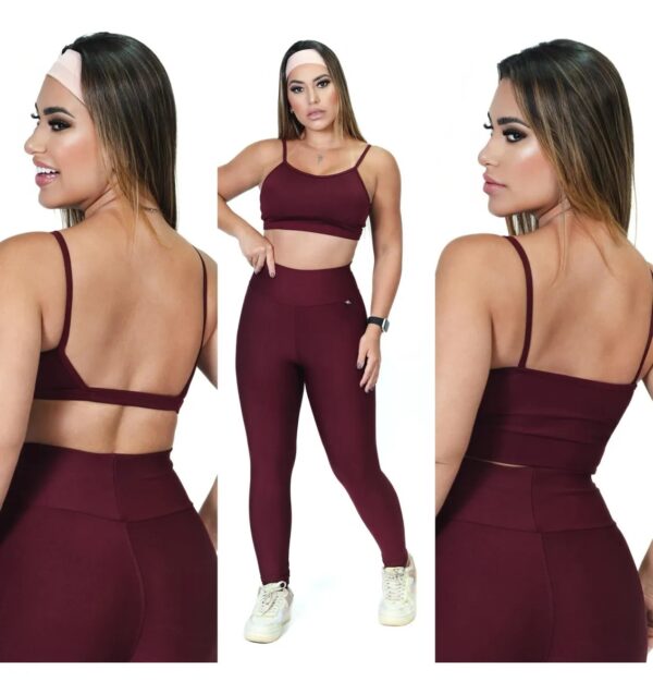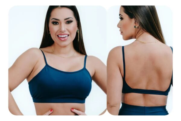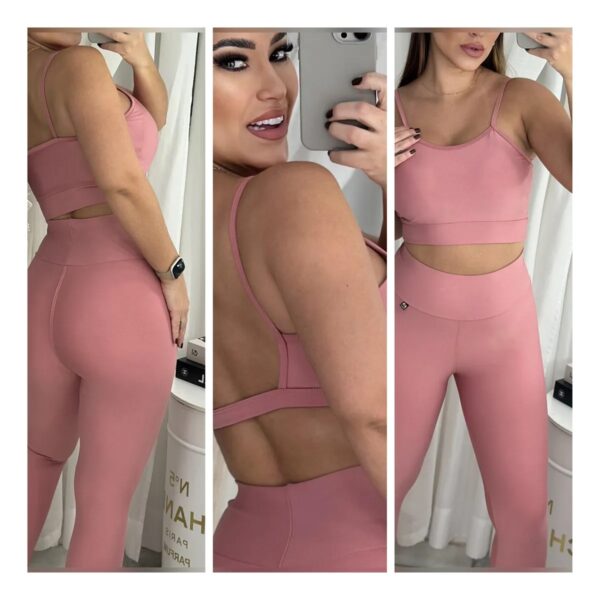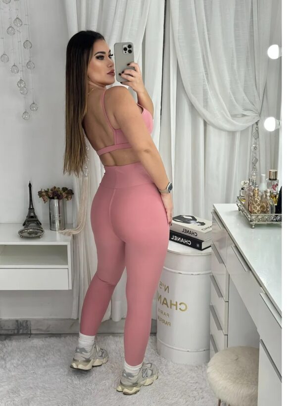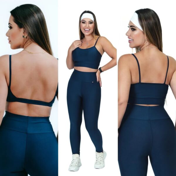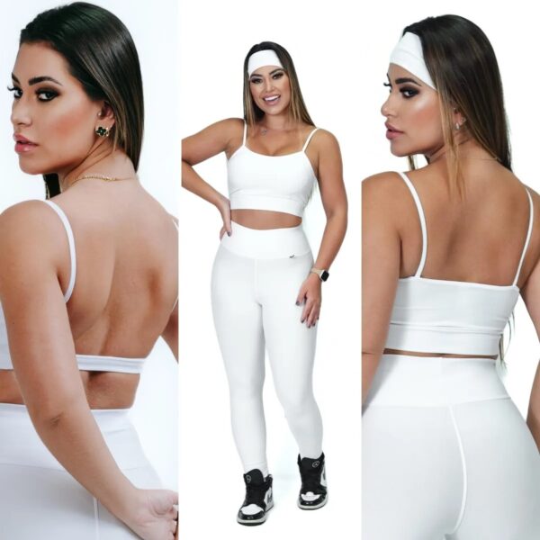 A calça cintura alta e elástico e o top 1 costa aberta e outro costa fechada.